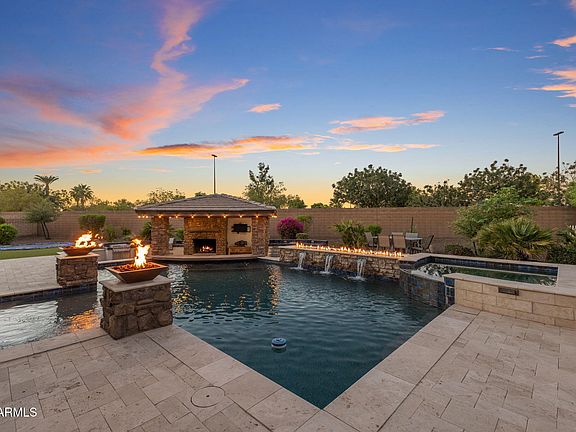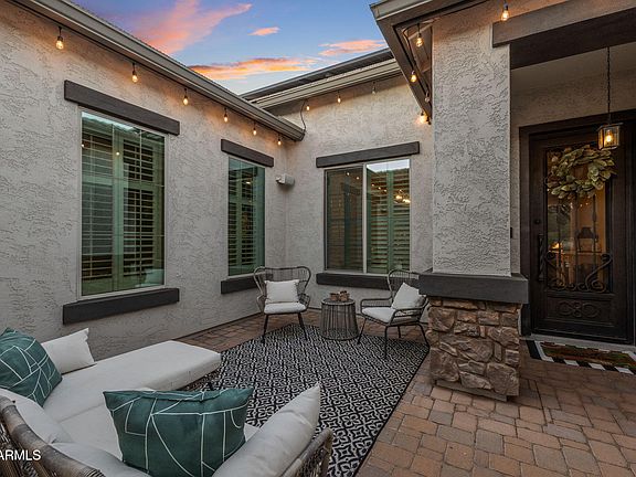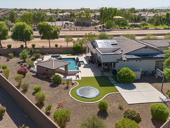 Tucked away on a private cul-de-sac lot in Gilbert's highly desired Velvendo community, this 4 bedroom, 3 bath home offers 2,826 sq. ft. of stylish living with a true balance of function and comfort. The open floor plan highlights a large great room with extended sliding glass door, perfect for indoor-outdoor living. A dedicated office and den (currently used as a workout room) provide flexible space for work and play. The chef's kitchen is designed with upgraded cabinetry, quartz countertops, a spacious island, double ovens, and a built-in microwave. The retreat-style primary suite offers dual vanities, a large walk-in shower, custom walk-in closet, and private exit to the backyard. Three additional bedrooms and two full bathrooms are thoughtfully positioned on the opposite side of the home for added privacy. The laundry room with custom cabinetry makes everyday living convenient.