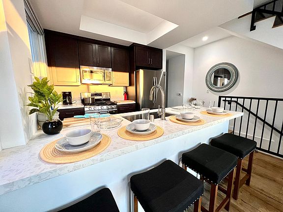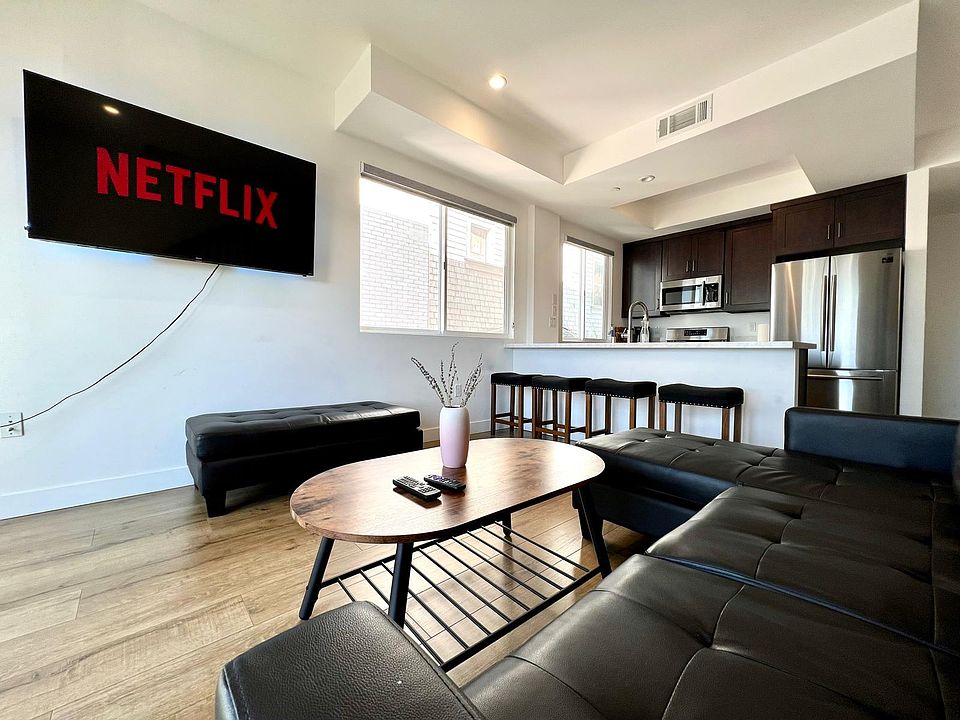 This classy townhouse is situated on a quiet street on the edge of Koreatown. This fully furnished modern build out is capacious and beautifully lit with natural light during the daytime. Not only is it equipped with a full kitchen, balcony for brunch, and living room, it also boasts a rooftop with a hammock and spectacular views of the city. Highly functional, wonderful location, eager to please. Enjoy your stay! $6500 inclusive of all utilities