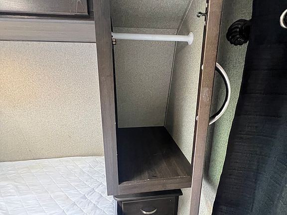 Spacious 2 bedroom, 1 bath Springdale RV with one pullout located in a small and peaceful RV park. Bathroom has shower and tub. There is a set of bunkbeds and great armoire type storage near the bunkbeds. There is a good amount of storage in master bedroom. It has its own fenced yard with included storage shed.