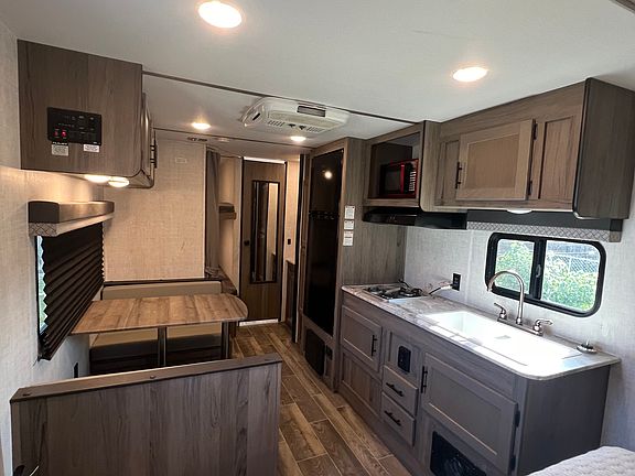 Cozy 2 bedroom, 1 bath Kingsport RV located in a small and peaceful RV park. Bathroom has shower and tub. There is a set of bunkbeds. There is a good amount of storage in master bedroom. It has its own fenced yard with included storage shed.