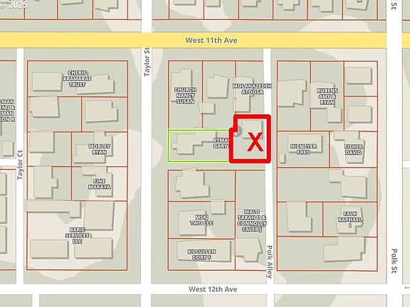 INVESTOR/DEVELOPER ALERT. 4,500 square foot lot with Polk Alley lot for access. Lot to be partitioned (not currently a legal lot). Zoning: R-2 Medium-Density Residential (S-C) Chambers Special Area. Buyer to be responsible for cost of partitioning. Detached 2 car garage (672 square feet) pre-existing built in 2005 (permit 04-04195-01). Eugene Planning says up to 4 units could be built. Partition or Middle Housing Land Division process offers 2 ways to complete the partition depending on what is planned (one or up to 4 units). Convert the garage to living space?