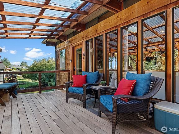 Frank Lloyd Wright inspired home with fantastic views of Mount Rainier, Puget Sound, & Chambers Bay Golf Course. Entry opens up to a gorgeous kitchen/dining area w/cedar wood throughout, stainless steel appliances & plenty of storage. Large living area that steps out to your private porch w/stunning views. The main level of the home features a primary bedroom w/en suite, 3 additional bedrooms, full guest bath, & laundry. Unfinished basement w/tons of potential to add additional living area. Basement is plumbed for a bathroom, has a 2nd laundry area & its own exterior entrance. Attached 1 car garage & space on the lot for outbuildings. Beautifully landscaped w/fruit trees. This home is ideal for a year round private oasis.