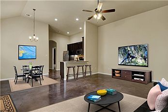 These Luxury duplexes, spacious, contemporary design, high ceilings, ceiling fans, concrete stained flooring. Open kitchen, recessed lighting, granite counters, 42" cabinets, back splash lighting. Stainless appliances including refrigerator. Large master bedroom, double sink vanity. Covered back covered patio with fan and two car garage. Located 30-minutes from San Antonio and 20-minutes from New Braunfels. Owner maintains front yard.