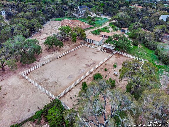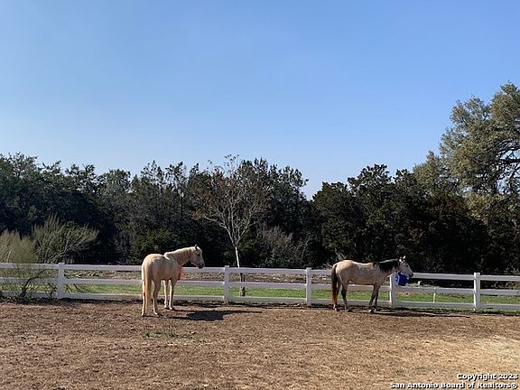 Quintessential Smithson Valley Horse Ranch outfitted with stable facility of 9 horse stall accommodations on 5.44 acres! This rare estate affords serenity, privacy and is the equestrians perfect dream- nestled in the highly desirable location off from the main Smithson Valley Road in the Hill Country. Horse stables constructed by Barn Masters- the facility includes exterior runs, storage/tack room, metal hay structure, 3 adjoining corrals and pastures! Ample access to the stables to accommodate hauling vehicles and horse trailers. The stables are situated towards the back of the property and has shade trees and water supply for horses. The elegant residence features 4 bedrooms, 3.5 baths, loft, a study on the main level with 3,500 sq. ft. and complete with a pool and hot tub! Located on a quiet street (that dead ends), the residence is fenced, gated and is tucked amidst mature oaks, crepe myrtles, and mountain laurels. You are greeted to the home via the covered porch that spans the front of the home and the dramatic entrance and fixtures. A light filled vaulted foyer with views to the formal dining room and the gorgeous family room beyond. The great room with centerpiece fireplace is framed by dual French doors that overlooks the patio with glistening pool and hot tub! This is open plan living at its finest that flows to the gourmet kitchen with custom cabinetry, 2 ovens, gas cooking, stainless appliances, an island, pantry, a breakfast bar and breakfast area! A spacious owner's retreat on the main level with 2 patios has an adjoining 5-piece spa en-suite with separate vanities, soaking tub and glass block windows for natural light. Upstairs is a balcony/ loft area, a bedroom with an en-suite is ideal for guests and 2 additional bedrooms share a bath which completes the plan. The laundry room has floor to ceiling white custom cabinetry for added storage and is conveniently located off the kitchen and has patio access. A half bath with new vanity, mirror and recessed lighting on the 1st level is well situated for direct access from the pool area. The backyard features a large patio for barbeques, lounging and entertaining poolside while enjoying sunsets, fauna and the peaceful surroundings. Wood and tile flooring on the main level, wood stairs, freshly painted inside and out (including garage), new carpet, designer lighting, ceiling fans, bath mirrors, recessed lighting upgrades, landscaping and more! Circular drive, plus plenty of space for horse trailers and less than a minute walk to the stables from the residence! Field stone pathways to the 2 car detached garage with breezeway. Water Well provides ample water for horses, pool, garden and residence. This location offers conveniences, shopping, dining, Comal Schools and access to major roads. This property is turnkey ready, just bring your horses- welcome home to your equestrian reverie in the Texas Hill County!