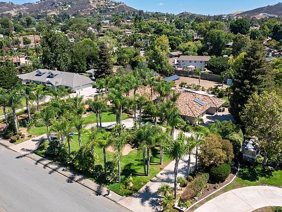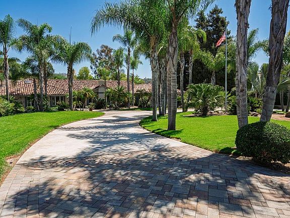 Welcome to this stunning single-story estate on one of Vista’s most sought-after streets set on nearly an acre (.95) with a circular driveway, and a private automatic gate leading to the saltwater pool and huge backyard. This 4-bedroom, 3.5-bathroom home offers exceptional privacy, space, and luxury. A 3-car garage with a convenient half bath, solar, well, whole house fan, and water filtration system add to the home’s functionality and efficiency. Plenty of space is available for an ADU, RV, or recreational toys. Step through the custom double front doors into a bright and open floor plan designed for both entertaining and everyday living. The formal dining room features built-in display cabinetry, while the living room offers a cozy fireplace. The spacious family room boasts vaulted ceilings, skylights, track lighting, a ceiling fan, a fireplace, and a wet bar with a refrigerator. The chef’s kitchen is beautifully appointed with Dacor double ovens, a Sub-Zero refrigerator, an ice maker, a Viking cooktop on the center island, a breakfast nook and a garden window overlooking the sparkling saltwater pool and backyard. The primary suite is a true retreat with two closets, a fireplace, and direct access to the backyard. The spa-like primary bathroom includes a separate shower and soaking tub, Toto toilet and bidet, and views of the private atrium. Additional bedrooms are complete with ceiling fans, while the laundry room includes a utility sink. Upgrades such as stone flooring, plantation shutters, crown molding, soft fit ceilings, retractable screen doors, automatic window shades, and recessed lighting complement the home’s timeless style. Mature landscaping with gorgeous palm trees surrounds this one-of-a-kind estate, creating a tranquil and private setting. A true jewel in Vista, rarely available and impossible to duplicate.