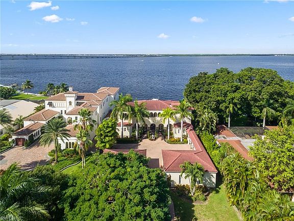 Welcome to this stunning W.A. Bud Lawrence designed riverfront estate. Situated on 2/3 of an acre, with over 100 feet of Caloosahatchee River frontage, this home offers an unmatched level of privacy and exclusivity. With over 5,000 square feet of living space, 4 bedrooms plus a den, 4 full bathrooms, 2 half bathrooms, formal and informal living spaces centered around an expansive kitchen, and a large first floor master suite, this home lives extremely comfortably. With beautiful finishes and fixtures throughout, such as custom solid wood cabinetry, marble floors, and top of the line GE appliances, you'll enjoy a lavish and comfortable lifestyle here. With an outdoor kitchen and large under truss seating areas that surround your infinity edge pool and heated spa that overlook the river, this home is built for entertaining. Upstairs offers 3 large guest bedrooms all with private bathrooms, and 2 outdoor balconies, one looking over the pool area and river. In the front you're greeted by a private gated entry, a guard house, and a 4 car garage. Including a half bathroom for guests downstairs, and a private pool bath, this home was built with a luxurious lifestyle in mind.