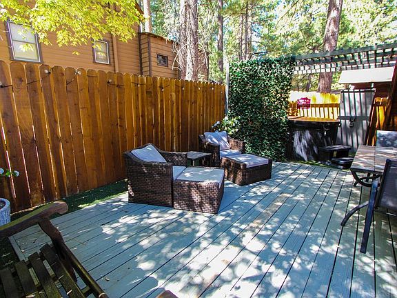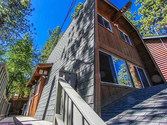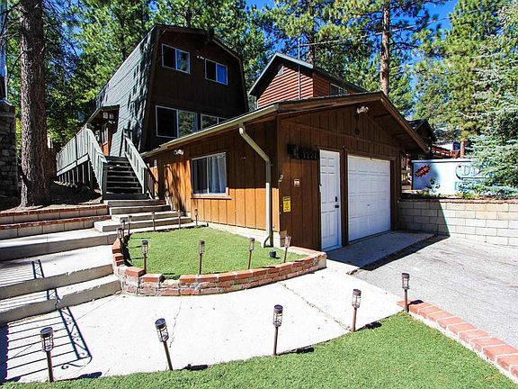 You’ll love this classic Gambrel home in the highly desirable 92314 zip code in Moonridge, near Fox Farm! Located on a quiet street with a large empty lot across the street. Conveniently near Bear Mountain, the golf course, Zoo, and the newly improved Moonridge corridor. It has stunning pine wood vaulted ceilings with appealing stained exposed beams throughout the home. Kitchen has a beautiful farmhouse sink and faucet, modern quartz countertops, and a rustic live-edge wooden breakfast bar. It is equipped with new appliances, including an added dishwasher. The tile backslash and open shelves provide a clean, modern look. The 1.5 car garage is currently used as a game room (7’ pool table with ping pong top, darts) and laundry room; potential to change to an ADU. The home features wood laminate flooring, new carpet upstairs, a brick gas fireplace, and six new electric heaters (bedrooms, garage, bathroom, in addition to the forced air heater downstairs.) A new tankless water heater in the garage has made available its closet by the front door… great for a cleaner’s or coat closet! The home has all new furniture included, providing for a turnkey short-term rental or family vacation home! Its large deck starts as you walk up to the front door, and wraps around to the backyard for your own mountain Oasis! Enjoy the large pine and oak trees surrounding the property, as you relax in the hot tub and stargaze. Complete with outdoor shed for tools, snow shovel, etc. Bistro lights surround deck walkway as well as pergola over hot tub – including outdoor table and patio chair set. Home is equipped and monitored with full ADT security system – Five cameras with a wall unit control center and kitchen display. 2 nest smart locks on front and garage doors… Lets unlock the door to your dream home!