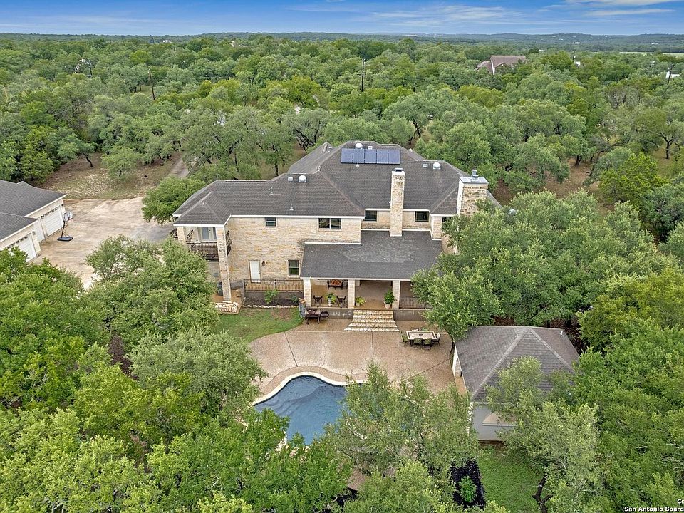 Hill Country luxury meets everyday livability at 1130 Whispering Water. This 5,729 sq ft custom estate sits on 4.4 serene acres in the highly desirable Guadalupe River Estates POA - just minutes from River Crossing Golf Club, Canyon Lake, and top-rated Comal ISD schools. Designed for the discerning buyer who values space, elegance, and energy efficiency, this home features solar panels, fresh interior paint (2025), and a rare combination of indoor sophistication and outdoor indulgence. Enter through double iron doors into a sunlit foyer with tray ceilings, custom maple cabinetry throughout, and wood staircases with wrought iron balusters. The gourmet chef's kitchen includes granite counters, a walk-in pantry, island seating, and a stone-accented cooktop niche - all opening to formal and casual living spaces ideal for hosting. On the main level, a dedicated home office offers work-from-home convenience, while the wet bar/entertainment room sets the mood for your private speakeasy-style lounge or game night getaway. The upstairs layout includes a flex room perfect as a movie room, second living room, guest retreat, or creative space, complemented by three gas/electric fireplaces throughout the home (living, primary suite, upstairs). Step outside to your private resort: Resort-style pool with waterfall, built-in slide, and attached spa Covered stone cabana, outdoor shower & restroom. Oversized circular driveway, 6-car garage, and pads for RVs or boats Enjoy peaceful views, mature oak trees, and daily visits from deer and native birds - nature surrounds you. For only $97/year, the POA grants access to the private Guadalupe River park - the perfect spot to float, picnic, or fish. This home is ideal for buyers seeking privacy, space to entertain, multigenerational living, or a second home getaway close to the water. Conveniently located: 1.5 miles to River Crossing Golf Club ~4 miles to HEB, dining, and Bulverde conveniences ~10-15 min to Canyon Lake ~25-40 min to New Braunfels & San Antonio Schedule your private showing today and experience Hill Country living at its finest. 24-hour notice required due to tenant occupancy. Please do not interact with tenants directly.