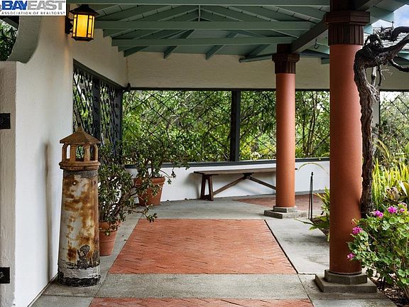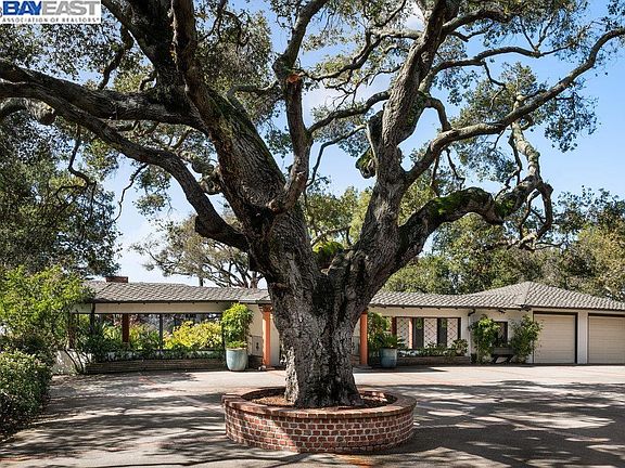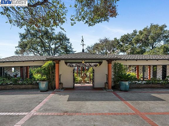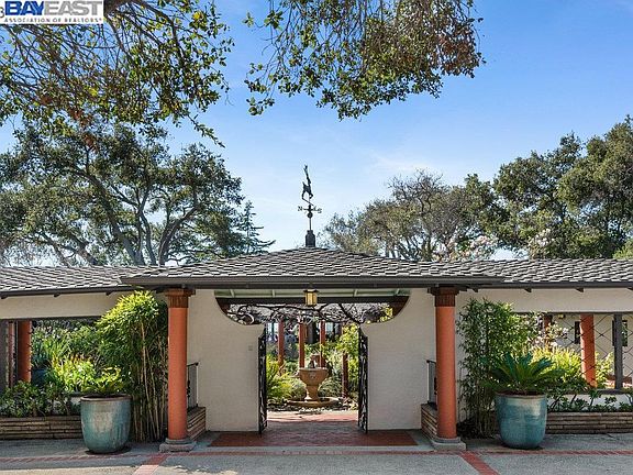 Discover an extraordinary Mid-Century California home, offering unparalleled privacy, serenity, and panoramic views of the San Francisco Bay. Nestled on a hilltop amidst nearly 10 acres of oak groves and lush gardens, this sanctuary boasts an expansive courtyard, covered loggia, and 3 Bridge bay view. The interior features a gourmet chef's kitchen, coffered ceilings, and parquet floors. The lower level has two bedrooms, a full bath, a spacious family/game room with a large wet bar, and a media room with a sound dampening acoustic ceiling. The estate also includes an attached 2-car garage, circular drive, huge detached workshop, and an additional backyard structure for playhouse or storage. Located in Chabot Park Estates, this home is near Lake Chabot Regional Park, Knowland Park Arboretum, Chabot Golf Course, Sequoyah Country Club, and Bishop O'Dowd High School. A rare opportunity to acquire a remarkable estate combining beauty, nature, artistic living, and comfort on one of the largest remaining land holdings in Oakland.