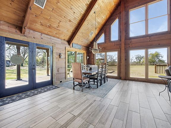Acreage, privacy, and potential in Pilot Point. This 2.27 acre property delivers a rare combination of character, space, and flexibility just minutes from town. The main home features a vaulted great room with floor-to-ceiling windows, warm wood ceilings, a stone fireplace, and wide-plank flooring. The open kitchen includes a large island, decorative lighting, stainless appliances, double ovens, and excellent prep space.