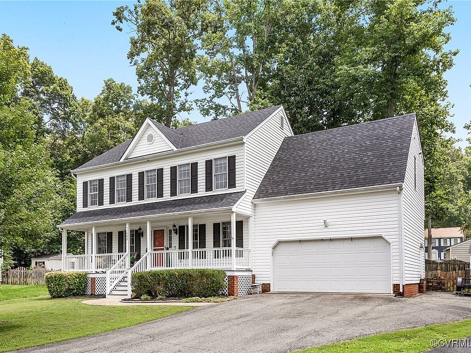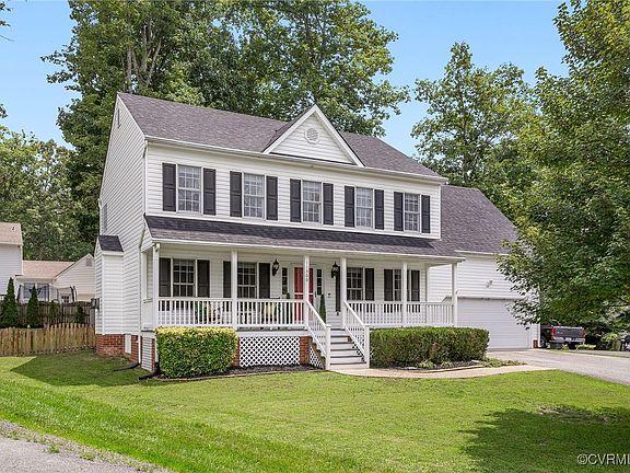 Welcome to 11300 McCauliff Ct in popular Monacan Hills. This well-maintained home is over 2,100 square feet & move-in ready. The inviting, full, front porch welcomes you to this lovely home. Inside you'll find hardwood floors in the foyer & formal dining room. The sun-filled eat-in kitchen is spacious & has BRAND NEW FLOORING, white cabinets, updated counters, double oven & stainless appliances. The kitchen opens to the 17x14 family room complete w/ updated flooring, fireplace & double doors leading to the rear deck..the perfect spot for entertaining. Upstairs you'll find the primary suite w/ WALK-IN CLOSET RENOVATED BY CLOSET FACTORY, primary bath w/ double vanity, shower & garden tub. Three additional bedrooms are all sizable + a walk-up attic - no lack of space in this house. Upstairs you'll also find a full hall bath w/ brand new floors, neutral vanity & tub/shower. THE SPACIOUS LAUNDRY ROOM is conveniently located on the second floor & has been RENOVATED BY CLOSET FACTORY, TOO! The lovely rear yard is fenced, has a deck & fire pit..a perfect space. An attached 2 car garage offers plenty of space for parking or could be a workshop - you choose! UPDATES INCLUDE **BRAND NEW ROOF (INSTALLED 7/3/25)**, VINYL SIDING, HVAC REPLACED (approx. 2015), HOT WATER HEATER REPLACED (approx. 2015), PAVED DRIVE, FENCED REAR YARD, NICE DETACHED STORAGE SHED. All this & a desirable cul-de-sac location, walking distance to schools, swimming pools, the library & more! Easy access to Rt 288 and Powhite Pkwy, close to restaurants & shops.