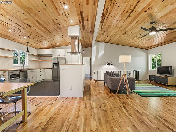 Mid-Century Modern Daylight Ranch home on a dead-end street. From the breezeway, walk thru your knotty alder full-lite door into open concept living. New white oak hardwood floors, custom-made basswood tongue and groove ceiling throughout the entire main floor. MOD fireplace with cut river rock hearth. New kitchen with white oak butcher block counters, shelving and trim details. Conversion varnish European-style cabinets, marmoleum flooring, built in drawer style microwave, stainless-steel appliances, cook island with stainless steel venting. Tons of natural lighting in the interior. Lower floor has its own exterior entry, Family room with fireplace, 2 bed/bath and large laundry room. Get lost in the expansive space of the back yard, with large old growth trees, entertainers' deck with metal roof pergola.1 car garage with a work room in back. Plenty of storage and space to work on your hobbies. So much to offer in your new home.