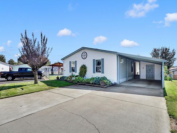 Homes don't come on the market very often in this centrally located 55+ community. Highly desirable park is a delight from the moment you arrive. This is a beautiful 2 bedroom, 2 bathroom home with a delightful deck, yard, and garden space. Home has vaulted ceilings and open kitchen, dining and living rooms space. Large primary bedroom with walk in closet and oversized primary bath with walk in shower, new flooring, double sinks, and lots of storage. Kitchen is open and spacious with lots of cabinets and room to cook and move around. 3 parking spaces including a covered carport. Shop space off carport is insulated with electricity and is great for projects with a workbench as well as storage. Garden beds plus established, producing, grape vines, blueberries, and raspberries. Sprinkler system keeps everything green and watered. Low maintenance vinyl siding, vinyl windows, and pex plumbing. Lot rent includes snow removal and sewer. New heat pump installed September 2025.