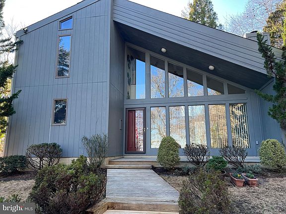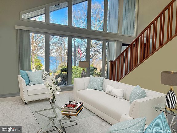 Coastal contemporary one street over from the Chesapeake Bay! Beautiful architectural design featuring cathedral ceilings & lots of windows so you can enjoy the sunrise views and watch the ships that sail by. Kitchen remodel included maple cabinets, granite & hardwood flooring. Main level has a full bath & den. Two bedrooms & full bath on second level. Second staircase to master suite addition. Pella windows. Oversized garage and storage room. Detached shed. Two attached sheds. Wrap around deck. Dual zone HVAC. Gas fireplace. Cove Lake neighborhood civic association gives you private beach access on the Chesapeake Bay, Boat launch, & Lake for paddle boarding or kayaking. New septic tank & drain fields installed June 2023.