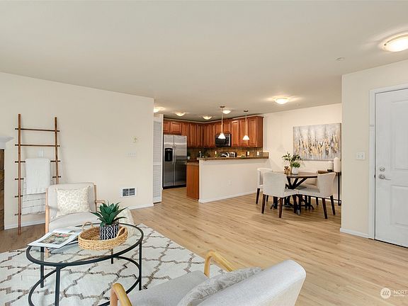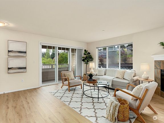 Well located and move in ready 2 bedroom/2 bath flat. Featuring an open concept kitchen to living room with slate tile surround fireplace, brand new LVP flooring, maple cabinets and stainless steel kitchen appliances, in-unit full sized washer and dryer. Primary suite with walk-in closet, en suite bath with duel vanity. Close to bus line, I405, Village at Totem Lake, shopping, movie theater, Microsoft, Google, Evergreen Medical Center, Downtown Kirkland, Juanita beach park, LA fitness and Costco. Excellent Lake Washington schools, well run HOA. All appliances included.