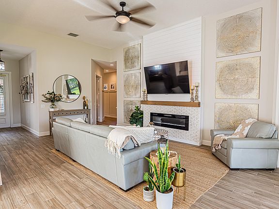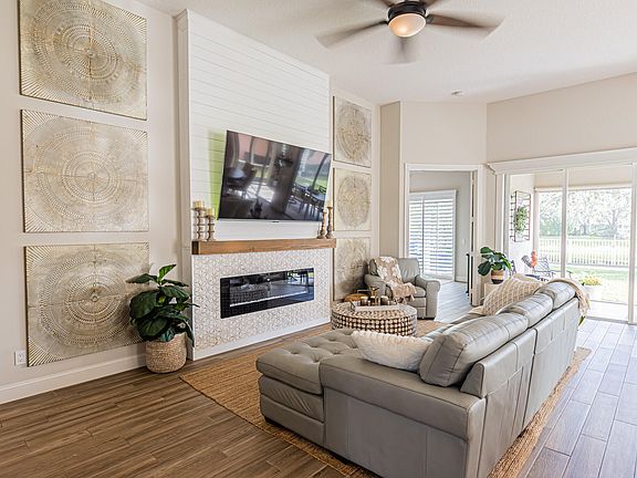 Lakes at Tradition! Make this dream home yours today, move in ready! Luxuriously updated 3/2.5/2 lakefront home with a spacious den, offers the perfect blend of style and comfort. Located on a serene lake, enjoy breathtaking views from your large, covered and screened lanai and big fenced yard. Inside, the open layout invites natural light with beautiful wood-look tile flooring throughout for a seamless flow. Elegant plantation shutters, wood trim accents, crown molding, shiplap add a touch of sophistication, while the modern finishes create a warm, inviting atmosphere. Kitchen features quartz counters, stainless appliances, ample wood cabinets, pull outs. Great room offers decorative fireplace and wine bar to set the mood. High impact double sliders. A definite must see! HOA dues provided full lawn care, exterior painting, cable, internet. Fantastic community amenities include 2 pools, fitness center, basketball, dog park, tennis, pickleball, play areas. Convenient to all Tradition has to offer! Interest rates too high? Ask us for more details on our Lender Buy Down programs **GC ROOF CERTIFICATION REPORT CONFIRMS 21 YEARS REMAINING LIFE - AFFORDABLE HOMEOWNER INSURANCE AVAILABLE.