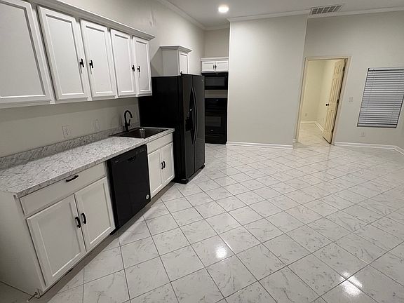 Inside, you'll find bright open living areas, sleek tile flooring throughout (no carpet!), and high ceilings that make the space feel spacious and inviting. The kitchen features modern white cabinetry, black finishes and appliances, with stylish countertops ideal for cooking or entertaining.