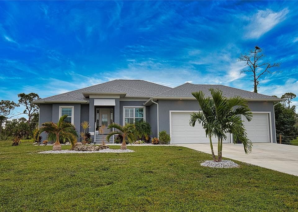 Welcome Home! This stunning coastal-style residence in Rotonda West was built in 2023 and is situated on a spacious .33 acre lot that offers the perfect balance of everyday comfort and luxury living. Featuring a 3-car garage, professional landscaping, and a full lawn irrigation system, this home impresses from the start. Enjoy year-round peace of mind with impact-rated doors and windows throughout. An assumable and transferable flood insurance policy is available. Inside, the open-concept floor plan flows beautifully with porcelain tile flooring and a stylish 6-ft windmill ceiling fan that enhances both comfort and design. The chef-inspired kitchen features Samsung Bespoke appliances with interchangeable panels, a custom backsplash, rattan pendant lighting, elegant granite countertops, and a pantry. The primary suite has lanai/pool access and offers a custom walk-in closet with access to the laundry room, dual vanities, a soaking tub, and a spacious walk-in shower. Additional bedrooms feature custom closets and ceiling fans for comfort and convenience. Step through sliding pocket doors to the spacious screened lanai, where you’ll find a sparkling heated saltwater pool—perfect for relaxing or entertaining. The fenced backyard provides privacy, peaceful wooded views, and backs up to a 8.5-mile biking and walking trail. The Peaceful & Scenic Community of Rotonda West is conveniently located to Beaches, Fishing, Kayaking & Boating. You’ll enjoy the community park, golf courses & nature trails! This coastal gem truly has it all—schedule your private showing today!