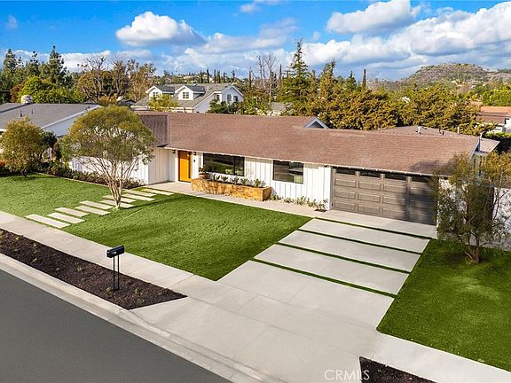 Stunningly reimagined single-story home in North Tustin, where every space—inside and out—has been meticulously transformed. Expanded by approx. 1,016 sq ft and gorgeously remodeled, it now spans 2,790 sq ft, offering 4 beds, 4 baths, an office (easily convertible to a 5th bed), and a dual-primary suite layout. Situated on a huge 10,200 sq ft lot, it perfectly blends modern luxury, spacious living, and ultimate comfort. Step inside to a bright, open-concept floor plan where the massive great room seamlessly merges living area, kitchen, and dining space. Every detail has been curated for aesthetics and comfort—from the limestone veneer fireplace to the lovely built-in bar. A large glass sliding door effortlessly connects the indoor living area to backyard, creating a spacious and inviting flow. Gourmet kitchen boasts an all-new layout and construction, featuring a dazzling waterfall quartz island, custom Euro-style soft-close cabinetry, new stainless steel appliances incl. six-burner cook range, and stylishly wrapped range hood highlighted by an expansive quartz backsplash, showcasing modern luxury with elegance. Big walk-in pantry offers ample storage. Home ideally features dual primary suites, each with sliding doors that open directly to the backyard, further unifying indoor and outdoor living. Left wing offers two beds, two baths, incl. an en-suite retreat. Right wing, part of the expansion, offers two more beds and baths, incl. a luxurious oversized primary suite with vaulted ceiling, huge walk-in closet with built-ins, and sliding door framing a picture backyard view. Master bath is entirely new, boasting a model-suite-inspired design with floating vanity, walk-in shower, and soaking tub for a spa-like relaxing experience. Remaining three baths feature intricate designer upgrades. Separate laundry room with sink. Front and back yards have been completely re-envisioned. Surrounded by lush lawn, trees, and new pavers, the serene outdoor spaces feature new drainage and irrigation systems, water feature, cozy fire pit with floating bench, and natural stone planters—offering an exceptional setting for entertaining. Two-car garage with new door and epoxy floor. Additional upgrades: replaced sewer lines throughout, new HVAC system incl. ducts, new water heater, new flooring, new black double pane windows & sliders, and more. Award-winning Tustin Unified School District. Conveniently close to shopping and freeways. No HOA & No Mello-Roos!