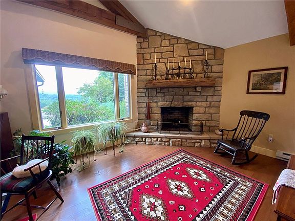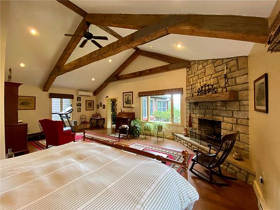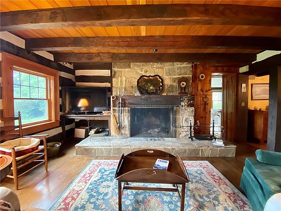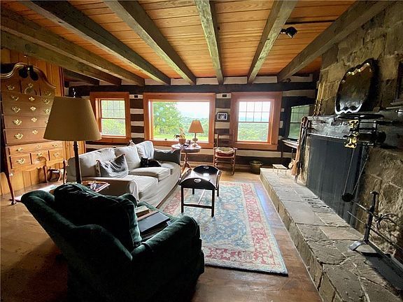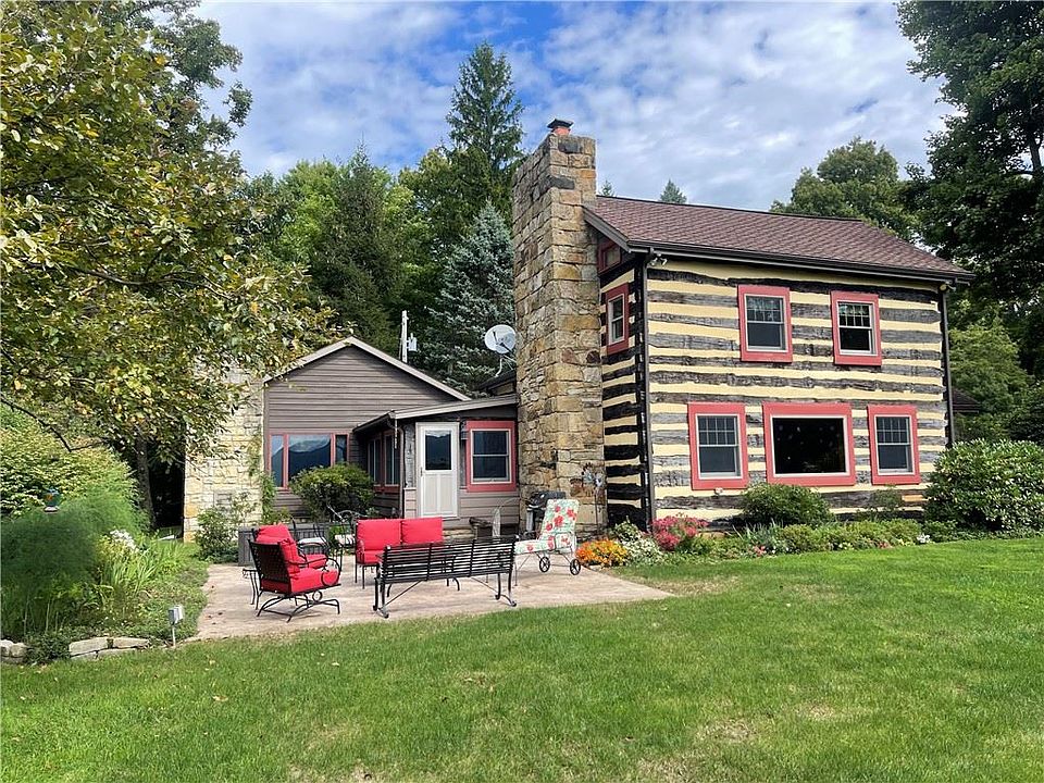 Capturing the epitome of the historic Ligonier Valley, this log cabin home offers a glimpse of the past but remains true to the present. Offering three bedrooms, two full bathrooms, a thoughtfully constructed primary suite including laundry and on-demand water heater, and a detached garage. A generously spacious guest home above the garage with its own separate entrance offers 2 bedrooms, 2 bathrooms, a kitchen, and a sunroom that takes in the beautiful view. Wander around the meticulously maintained gardens or discover trails around the 16 private acres of private land. Unwind on one of the 2 patios while taking in the breathtaking view.