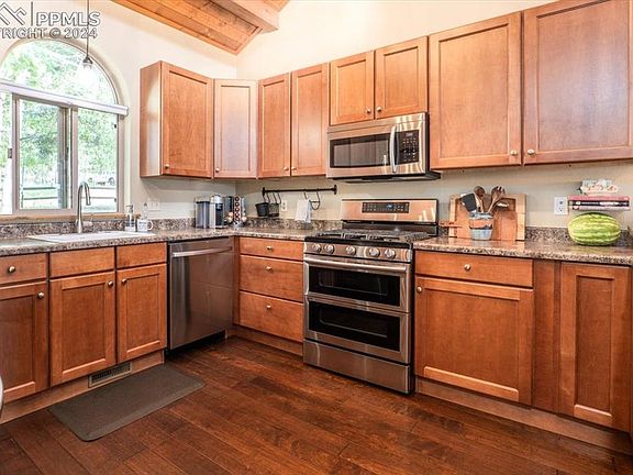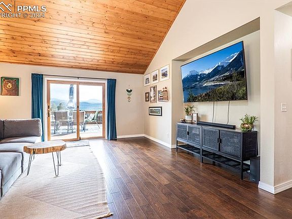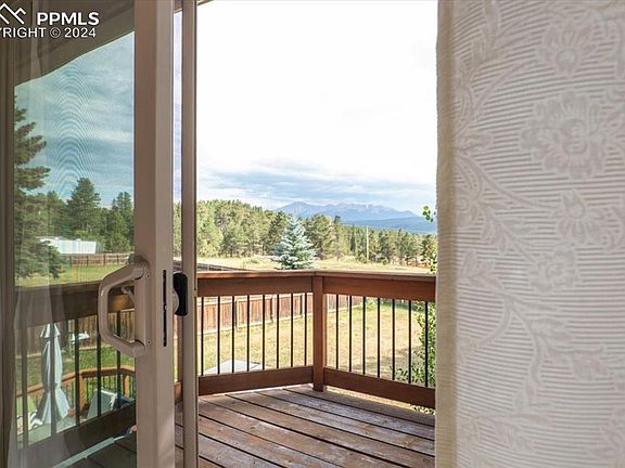 Big Pikes Peak views! This is mountain living at its best! This home has many special features including vaulted, open beam with tongue-n-groove ceiling, Luxury Vinyl flooring throughout main level, and a huge deck off the living room to take in those beautiful views of Pikes Peak and surrounding mountains. Upper-level master suite has its own private balcony, walk-in closet, and adjoining remodeled bath with granite and tile. The updated kitchen features beautiful wood cabinetry, vaulted ceilings, updated appliances, updated light fixtures, and plenty of counterspace to create mealtime masterpieces. Two nicely sized bedrooms, full bath, and laundry room also on the main level. Tons of closets and storage throughout. Amazing outdoor living space from the large wood deck with new Bullfrog R7 7-person hot tub and a fire pit. The deck is HUGE and south facing perfect for morning coffee, sunsets, stargazing, and barbecues! The fully fenced back yard has a dog run with entrance into garage, mature mountain landscaping, and perennial garden. 2-car garage plus oversized metal carport. In Woodland Park city limits with easy access to shopping, dining, and entertaining. Colorado Springs is only 20 minutes away and National Forest is very close by with access to trails from your front door. New efficient forced air furnace, new LED light fixtures, new hot water heater, propane Weber grill and any furnishings buyers want are negotiable!