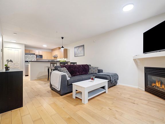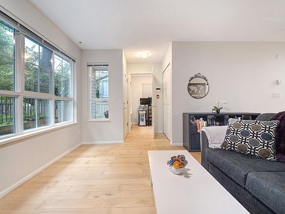 Rare townhouse-style unit with private front door entry in the well-maintained Highgate building - perfect for dog owners who want direct outdoor access! This end unit offers great privacy & tranquil views of mature trees through large windows. The 262 sq ft patio seamlessly extends your living space outdoors. Situated on quiet Ross Rd, enjoy peaceful surroundings with convenient guest parking nearby. The versatile floor plan features a large bedroom, a den ideal for a home office or nursery, and an oversized walk-in closet. Finishes include hardwood floors, gas fireplace, granite countertops, soaker tub. Pet-friendly for two dogs/cats. Includes parking and storage. Building amenities feature a fitness center & bike storage. Unique layout combines townhouse convenience with condo living!