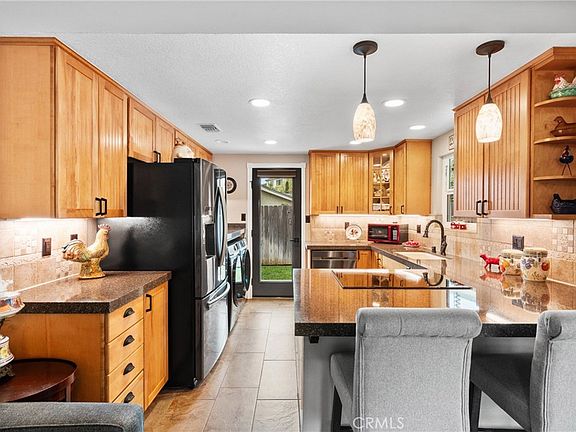 RV PARKING…CUSTOM POOL…NO HOA. Charming Mid-Century single story home with modern updates and a private pool oasis. Located in a highly desirable neighborhood in San Dimas, this home features 3 bedrooms, 1.75 baths with 1,244SF on a 7,768SF lot. Pride of ownership is evident at every turn. This cozy yet thoughtfully designed residence boasts updated finishes throughout blending mid-century details with modern conveniences. The custom front door welcomes you inside the large living room with plantation shutters, recessed lighting, and a cozy fireplace. The heart of the home features a gourmet kitchen with quartz counters, recessed lights newer appliances, bronze fixtures with a French door leading outside and a large kitchen window. Adjacent to the kitchen is an area that could be used as a dining or family room with an extended sliding glass door that leads to your amazing backyard. The entire home has newer dual pane windows that fill up the home with natural light. Throughout the home you will find upgraded baseboards, casings around all doorways, bronze door handles and fixtures, and ceiling fans. All of the bedrooms are good sized. The hallway bathroom has been remodeled with new vanity and quartz counters, new plumbing fixtures, toilet, flooring, and window covering. The primary bathroom is also remodeled with new double vanity, toilet, shower enclosure, flooring, and plumbing fixtures. There is another French door that leads to the backyard pool and secondary patio area. Outside, you will discover your private retreat is adorned with a custom patio and covered patio, in addition to a stunning pool that was remodeled in 2024 to include a baja shelf, PebbleTech finish, and a custom paver decking. The side yard has RV parking and gates that will accommodate a boat or RV. The private backyard is a true highlight with lush and meticulously maintained landscaping and offers a seamless extension of your living space for relaxing or entertaining. The home also features a new water heater, newer roof, newer heater and A/C, brick facade on the front of the home, and paint. Located close to many restaurants, shopping, and easy access to the 210 and 57 freeways. Plus, low property taxes and no HOA dues. Overall, this is an amazing place to call home. Welcome home.