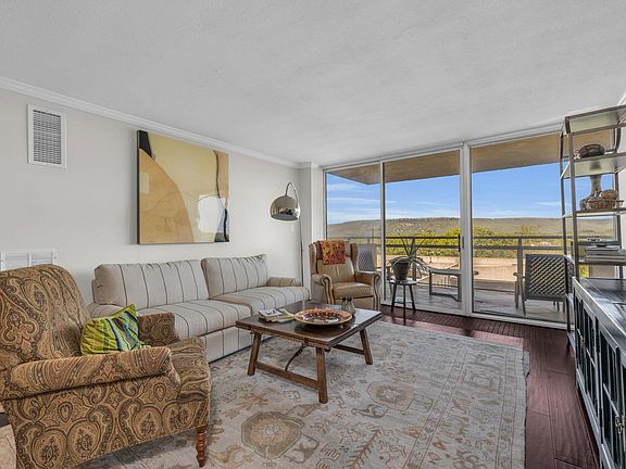 Own or Rent? You will love the spectacular views of the mountains and valley and the low maintenance living! This 2 bedroom, 2 bath corner unit condo is located in the iconic Pinnacle and is only minutes to all of the restaurants, shops and parks of the North Shore and Downtown Chattanooga. Step inside to the dining and living room that has panoramic views and the floor to ceiling glass doors leads out to your private covered porch that is perfect for relaxing and taking in the view. The kitchen has stainless appliances with plenty of cabinet and counter space. The owners suite has a walk-in closet and private bath. There is a 2nd bedroom and full bath, all on 1 level. This comes with 2 parking spaces. The HOA of $442/month includes: electric, water, sewer, trash, heat/AC, change of air filter once a quarter, quarterly pest control, and all maintenance outside of the condo (general maintenance) as well. The laundry room on the same level is free as well. For purchase option, the seller will give a $1,000 credit towards a new refrigerator. Lease option is also available! The Pinnacle amenities include club room, pool, gym, movie theatre and laundry room mentioned above. Make your appointment for your private showing today!