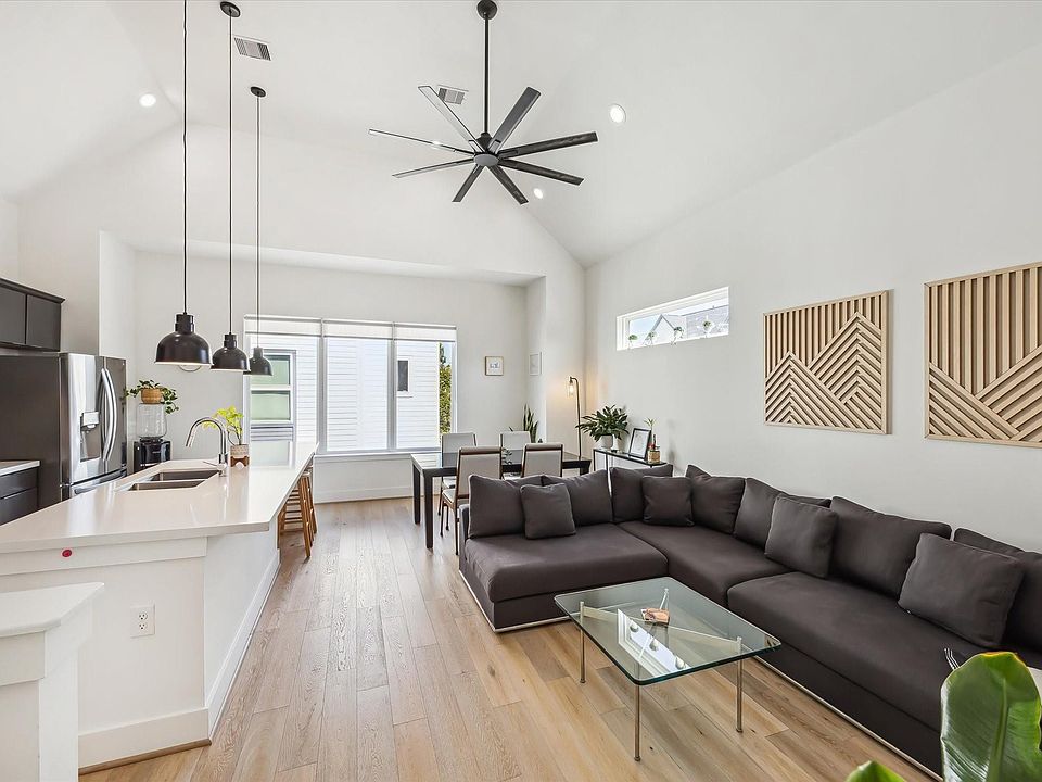 GATED COMMUNITY IN SHADY ACRES! This 2-bedroom, 2.5-bathroom STUNNER offers soaring ceilings, hardwood floors, and an open-concept living, dining, and kitchen area filled with natural light. Upon entry, you're greeted by a charming foyer with unique patterned flooring. The first-floor secondary bedroom features an ensuite bathroom and a full wall BUILT-IN bookcase/desk. Upstairs, the gourmet kitchen includes stainless steel appliances, pantry, gas cooktop, farmhouse sink, transom windows and bar seating. The spacious primary suite feels light, airy, and luxurious, featuring a tiled walk-in shower, double sinks, a transom window, and a custom walk-in closet. Surrounded by some of Houston's favorite local eateries, shopping, nightlife, and the White Oak Bayou Trail! Washer/dryer/refrigerator INCLUDED! Enjoy secure, stylish living with walkability and convenience at your doorstep.