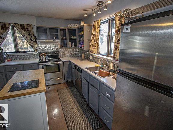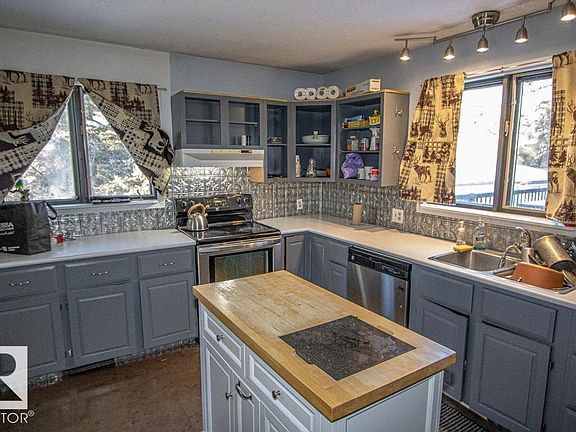 Located in a private setting along a peaceful country road, this character-filled home is tucked among towering spruce trees and offers inviting warmth and natural charm. The living room features a striking rock fireplace, vaulted ceilings, and large windows that showcase the surrounding forested landscape. The main level includes two bedrooms and a full bathroom, while the lower level offers an additional bedroom, a second bathroom, generous storage, and flexible space for recreation or entertaining. The walkout basement leads to a secluded outdoor setting, creating a seamless connection to the property’s natural surroundings.