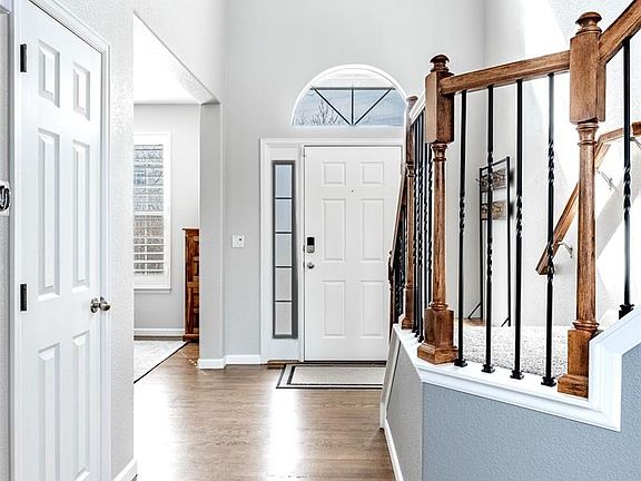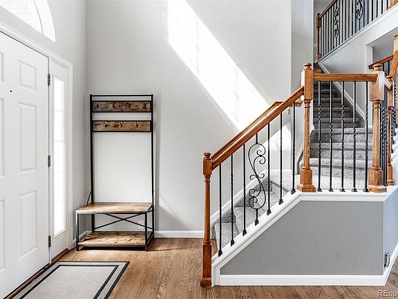 Soaring ceilings and generous natural light define this stunning residence. Situated on a quiet cul-de-sac in the Villages of Parker neighborhood, an inviting exterior is surrounded by new landscaping. An open floorplan gracefully unfolds w/ handsome wood flooring, new carpeting and vast windows w/ classic wood shutters. Tall ceilings draw the eyes upward in a spacious great room featuring a new custom fireplace surround designed w/ high-end Travertine. A gourmet kitchen is impressive w/ stainless steel appliances, slab granite countertops, a peninsula, large pantry and 42” white cabinets. A main floor bedroom provides the perfect space for a home office while a second-story loft and bonus area offer flexible living space. Retreat to a primary suite boasting a remodeled 5-piece bath w/ a walk-in closet. Sizable secondary bedrooms feature walk-in closets. Enjoy outdoor relaxation on a Trex deck overlooking a landscaped backyard complete w/ apple trees and views of open space and trails.