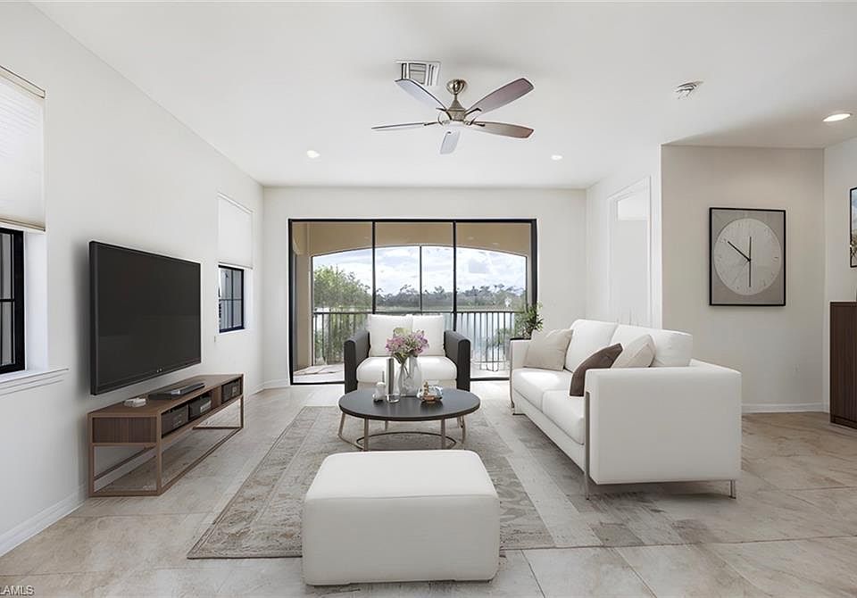 Welcome to this spacious 3-Full Bedroom End-unit Condo with sparkling Southern Lake Views and a charming fountain. The numerous Large Windows fill the condo with light in every room. Freshly Painted, this distinctive home features an Expanded Floor Plan, adding Extra Square Footage to the master closet and bath. Enjoy the bright, Open-Concept Layout with a Modern Center Island, Stainless Steel Appliances, newer Bosch Dishwasher, walk-in Pantry, All-Tile Flooring, Volume Ceilings, 8' Doors and a Culligan Water Softener. The 2nd floor unit also includes an Attached 1-car Garage and accordion Storm Panels for peace of mind. Located in the sought-after Paloma residential community, you’ll enjoy a Vibrant Lifestyle with Resort-Style Amenities, including a sparkling Resort Style Pool, Large Clubroom, Fitness Center, and Two Tennis Courts and Bocce Court Numerous Activities and Clubs include Bike Club, Billiards, Book Club, Bridge, Cafe of Life, Game Night, Ladies Luncheon, Mahjong, Poker Night, Coffee Meet-Ups, and Water Aerobics. Only minutes from the beautiful beaches of Bonita Beach and Fort Myers Beach, as well as premier shopping at Coconut Point Mall and Miromar Outlets. With convenient access to I-75 and the Airport, Paloma provides an ideal location for easy travel and endless recreation. This is more than a home—it's a Lifestyle!