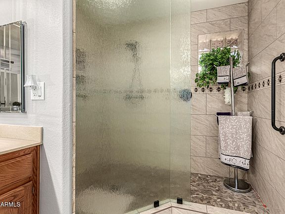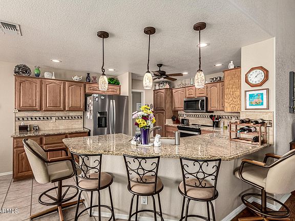 Fantastic retirement haven in the 55+ Sunland Springs Village! Nestled on a corner lot, the home offers 2 beds + den, 2.5 baths, 2..5 car garage, & manicured landscape. The inviting interior features tons of natural light, plantation shutters, designer paint, and tile & wood-look floors in all the right places. The large living room is made bright & airy by the vaulted ceiling! The impressive eat-in kitchen boasts SS appliances, granite counters, travertine backsplash, recessed & pendant lights, and a peninsula w/breakfast bar. Cozy dining space w/bay window! You have a double-door den that can be an office or extra bedroom. The carpeted main bedroom has an ensuite with dual sinks & a walk-in closet. You'll love the backyard with an extended paver-covered patio & a fire pit! Welcome home
