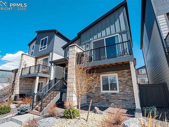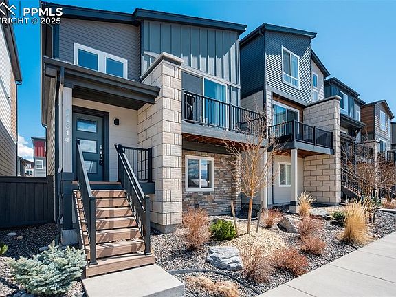 This is the one you’ve been waiting for! Experience contemporary living at its finest in this low maintenance home w/stunning views & walkable lifestyle. This home is perfectly positioned to capture unobstructed views of Pikes Peak & the Air Force Academy, combining intelligent design w/high-end finishes while being meticulously maintained as a secondary home. (Check out the end of the video on the virtual tour link for a glimpse at how close the Air Force Thunderbirds fly while viewing from the balcony.) Inside, a dramatic vaulted ceiling, brand-new carpet & expansive windows fill the open-concept living space w/natural light, seamlessly extending to a private composite deck-perfect for grilling & entertaining. The gourmet kitchen is a chef’s dream, boasting a striking full-wall tile backsplash, open shelving crafted from 180-year-old reclaimed wood, premium quartz countertops, Samsung SS appliances, gas range & a spacious island w/barstool seating. The primary suite is a serene retreat w/large windows, a 4-piece en-suite bath featuring a double vanity, quartz countertops & a stunning walk-in shower w/custom finishes. A secondary bedroom on the lower level offers versatility as a guest space, office or streaming room complete w/fiber optics & CAT5/CAT6 wiring for high-speed connectivity as well as a lovely 3/4 bath w/custom tile finish. Tech-savvy buyers will appreciate the TV/Sonos sound system and Kasa security system. This home also features AC, extra storage in the mechanical room & a two-car garage w/built in ceiling storage. Nestled in a vibrant, walkable community just minutes from InterQuest Parkway, enjoy premier dining, shopping, entertainment & minutes from the new Ford Amphitheater. With minimal maintenance, a nearby green space & walking paths this home offers both tranquility & urban convenience. Move-in ready & designed for the Colorado lifestyle!