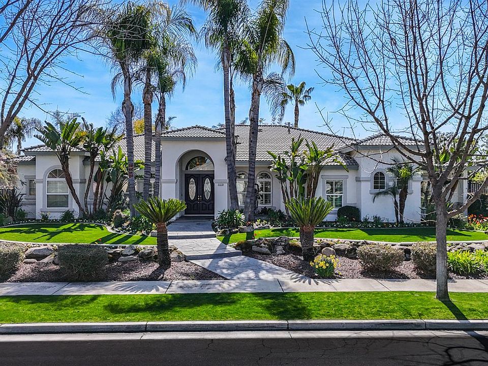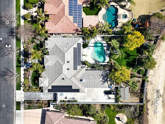 Luxurious Brighton Estates Masterpiece nestled on a sprawling 18,730 Sq. Ft. lot, this stunning masterpiece boasts 3,548 Sq. Ft. of well-appointed living space. Showcasing 5 bedrooms + office, 4 bathrooms, and an abundance of premium features. The great room, formal dining, and bonus living are complemented by a gourmet kitchen with black granite countertops and stainless steel appliances. An oversized breakfast bar overlooks the spacious living room, complete with a gas fireplace, built-in entertainment center. The lavish primary suite offers a sitting room, two-way gas fireplace, wet bar, separate shower, and indulgent jacuzzi tub. Dual vanity and generous closet space complete this private retreat. Mature landscaping and stucco block walls provide privacy, while the automatic gate lead to a 3-car garage. Outdoor living is elevated with a stamped concrete patio, a sparkling pool with waterfall perfect for entertaining. Also this home is powered by a fully owned 46 panel solar system
