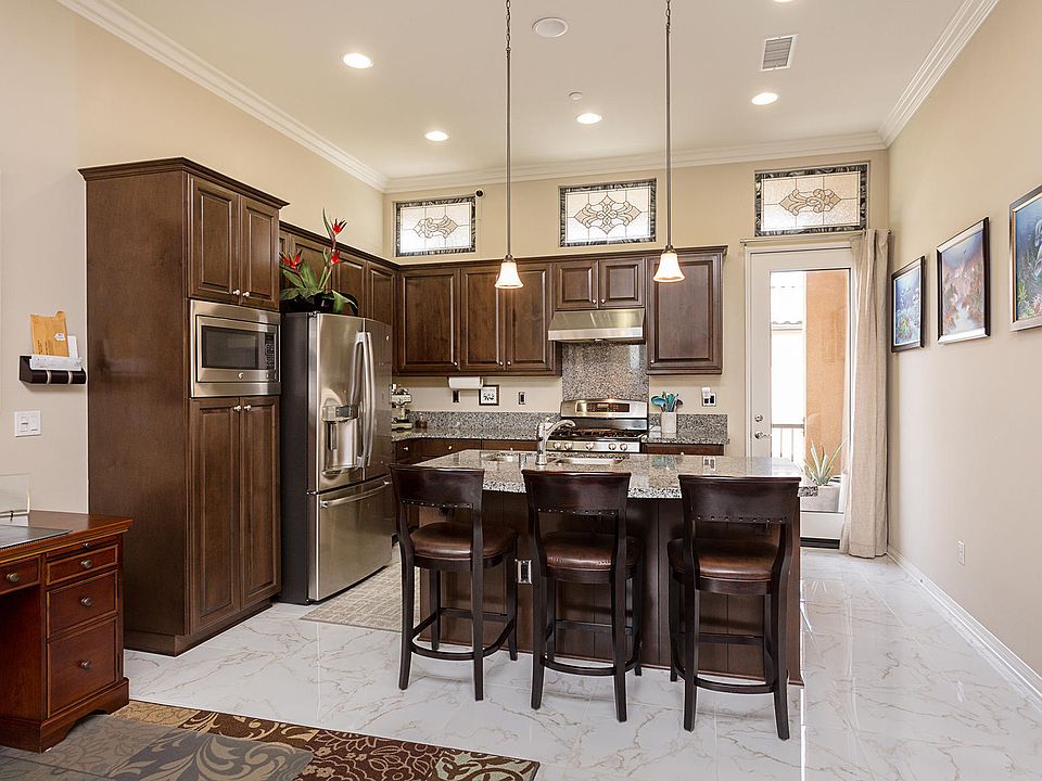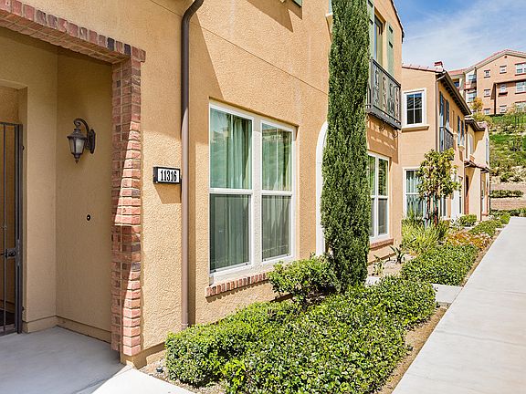 Behind guard gates of the Aldea complex, in Porter Ranch. Luxurious living, adorned with the finest upgrades including 12' ceilings, 20' porcelain tile floors, matching granite counters in both the kitchen & bathrooms, crown molding, tank less water heater & water softener. Other features include an over sized 2 car garage side by side with a EV charging box, along with a solar panel policy, a Nest thermostat & 2 cameras. This turn key condo also boasts decorator paints in neutral tones, is full of natural light, and is bright & light. The builder went to the extra care of including a lightweight concrete layer throughout to help sound proof each unit. The grounds of this complex feel like a manicured Vegas Resort with an Olympic size pool, 2 large spas, built in BBQ area with 2 large TV's & eating area. Minutes from the new open air Vineyards at Porter Ranch. Nothing to do here except move in & unpack.