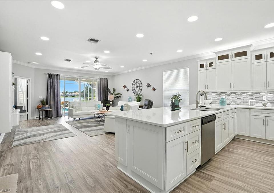 Huge Value. *Sophistication Meets Serenity Meets Value in This Stunning SilverLakes Residence* **All Big Ticket Items Taken Care Of For You.** Welcome to refined Florida living in the prestigious, gated community of SilverLakes in The Gateway. This meticulously maintained home blends timeless elegance with modern updates, offering three spacious bedrooms and 2 luxurious baths in one of the community’s most sought-after floorplans. From the moment you step through the vaulted entryway, you’ll be captivated by the home’s flowing open-concept design. The expansive great room, kitchen, and dining area provide the perfect setting for both relaxed everyday living and elegant entertaining. The completely remodeled gourmet kitchen impresses with crisp white cabinetry, stainless steel appliances, a massive island with bar seating, breakfast nook, and ample pantry—blending function and style with ease. Throughout the home, sleek plank flooring adds an air of luxury, while the trim and finishes sparkle. The primary suite is a private retreat, featuring well-lit roominess, dual vanities, a spa-like step-in shower, and wonderful walk in closet. Natural light floods every room, accentuating the graceful finishes and thoughtful details such as crown molding, designer trim, upgraded counters and appliances, and the luxurious view over your pool and the lake. Step outside to your own piece of Florida—overlooking the tranquil lake and take a dip on your own pool covered by a screened lanai offers- the perfect place to relax or entertain in privacy. This exceptional residence is built with both beauty and resilience in mind.