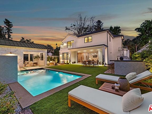 Spectacular custom-built home situated within the highly desirable area of studio city. Boasting 5BD/6.5BA this home has been meticulously designed to perfection and built with only the finest of finishes. Upon entering you'll be greeted by seamless oak flooring and an abundance of natural light. The chef's kitchen is a culinary masterpiece featuring a generously sized island, white oak cabinetry, glistening calacatta countertops, Thermador appliances, walk-in pantry, and a seamless connection to the living room. The expansive living room showcases a marble custom arched built-ins, and aluminum pocket doors that open up to the resort-like backyard, creating a seamless indoor-outdoor lifestyle. On the lower level there is an ensuite guest bedroom as well as a powder room for added convenience. Upstairs the exquisite master suite serves as a peaceful oasis with a cozy fireplace, a large walk-in closet, and balcony overlooking the backyard. The opulent master bath resembles a spa retreat with its soaking tub, shower, dual vanities with travertine stone. Additionally there are three more ensuite bedrooms upstairs along with a laundry room. The expansive backyard is surrounded by beautiful landscaping, tall fence ensuring privacy, and features a refreshing pool/spa and ample space for entertaining. Great pool house that feature a gym and amazing basketball court, as well firepit area and outdoor kitchen. Nestled within the highly sought-after tujunga village neighborhood. welcome!
