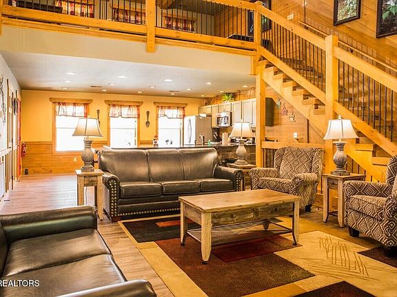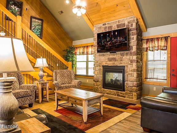 Location, Luxury, and Lifestyle! This extraordinary 4-bedroom cabin with indoor pool has it all, thoughtfully designed for entertainment and relaxation! Crafted of a fiber cement and stone construction, this one-of-a-kind residence features an amazing 3,512 SF layout within the amenity-rich Laurel Estates at The Glades. Step inside from the covered front porch to find warm wood floors and accents throughout the open layout, with soaring cathedral ceilings and a grand see-through fireplace anchoring the living room that is shared with the rear deck. This sophisticated floor plan invites gathering with a stunning dine-in kitchen featuring stainless steel appliances, granite counters, shaker-style cabinets, and stone-front breakfast bar. Head outside to take advantage of the therapeutic health benefits of the cabin's private sauna or settle comfortably in for the peaceful nature views while enjoying your favorite beverage. When it comes to R&R, the main level primary suite is an exceptional escape boasting mountain chic luxury with double sided fireplace shared with the spa-like soaking tub, while the ensuite bath is well equipped with double sinks and a walk-in shower. Ascending to the second floor, you will find that the game loft has everything you need for a good time including a pool table, air hockey, and arcade game. Two ensuite bedrooms crown the top floor, providing a serene destination where guests can kick back and unwind in style. Take the stairs down to the lower level to experience the crown jewel of this luxury cabin: an indoor heated saltwater pool and private theater room with a 70'' flat screen TV and tiered seating for movie nights. Along with these amenities is a covered deck that is a perfect destination for self-pampering where the soothing jets of the hot tub await! The fourth ensuite bedroom is also found on this level, adding a note of privacy to this recreation-filled floor. Laurel Estates at The Glades has quite a list of amenities of its own, including a clubhouse with swimming pool, pavilion with fireplace and BBQ grills, as well as a fire pit area. All of this and a central location in Gatlinburg where you'll find an endless array of attractions, terrific restaurants, and unique shopping experiences. Combining privacy, natural beauty, and exceptional amenities, this property captures the charm and splendor of mountain living, making it the perfect STR for your portfolio. Put this one at the top of your must-see list! Buyer to verify all information.