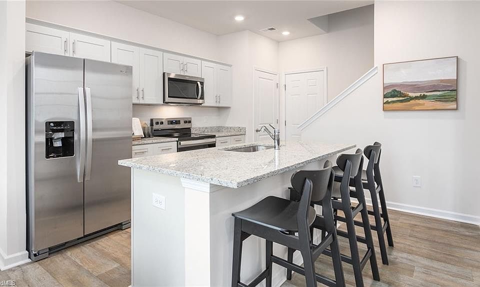 The Pattison in North Village Townes, located in Greensboro, NC, is a 2-story townhome with 4 bedrooms, 2.5 bathrooms, 1,658 sq. ft., and a 2-car garage. The open-concept design combines the kitchen, living, and dining areas, creating a great space for entertaining. The kitchen features shaker-style cabinets, granite countertops, and stainless steel appliances. Upstairs, the primary bedroom has a spacious walk-in closet and an ensuite with a walk-in shower, dual vanity, and quartz countertops. Additional rooms offer flexible spaces for home offices or bonus areas. Relax on the back patio. Contact us for a tour!