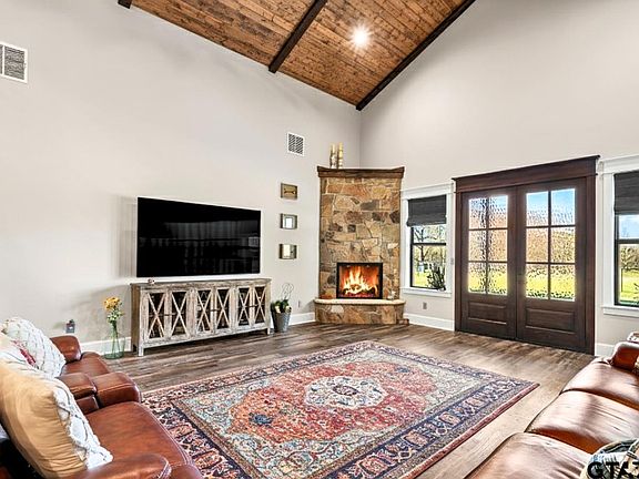 Stunning stone fireplaceSecret hidden roomElegant quartz countersTwo stocked spring-fed pondsVaulted ceilingsMassive islandProductive fruit trees