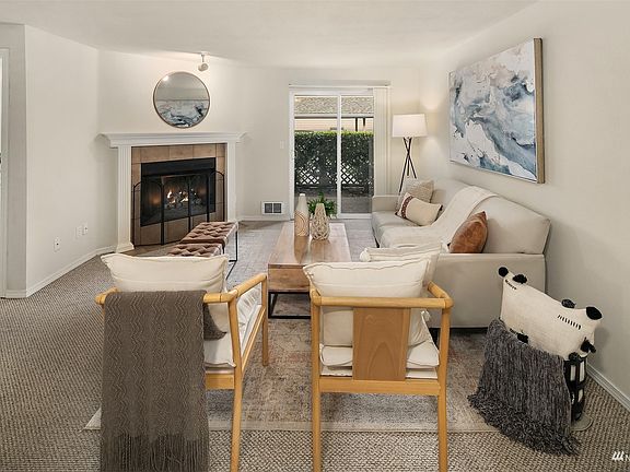 Quiet, cozy ground floor unit with access to peaceful Echo Lake. Freshly painted, 2 bedroom layout is easy to live in with in-unit washer and dryer, recent kitchen and bathroom remodels, wood fireplace and private patio with additional storage. Convenient location offers access to so much while still feeling private with gated access to a residents-only dock on the lake. No rental cap. Cats and dogs allowed. Dedicated parking spot and availability to rent a second parking space. Great for commuters- 2 blocks from Transit Center! Short walk from the Interurban Trail!