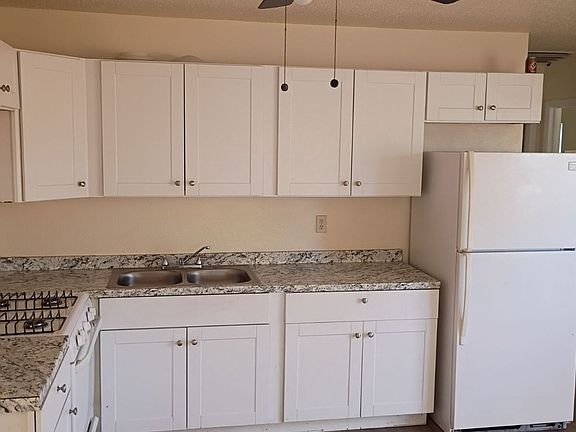 Bright kitchen with newer white cabinets, granite-style countertops, and gas stove