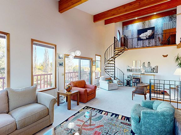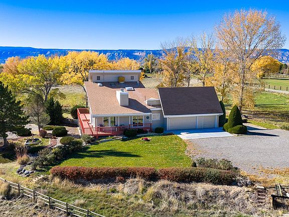 A unique custom built home with classic and contemporary features. This home is situated on 10.4 irrigated acres with 360 degree views and large fenced pasture for horses or other animals. Spacious 4 bed, 4 bath and approx. 2,973 sq ft of interior living space combines vaulted ceilings, exposed wood beams, and architectural brick fireplaces. Main living area features large windows framing valley vistas and a spiral staircase to a loft office overlook. Updated with new carpet throughout. Dining room includes a fireplace and sliding door to the rear deck for sunset color over the Bookcliffs & Monument views from the front. Kitchen offers tile counters, oak cabinetry, and a window viewing the landscape. Primary suite includes deck access and expansive views. Lower level family room has a fireplace and walk-out patio to the yard. Multiple living areas create flexibility for office, guest, and recreation spaces. Exterior features include an attached 3 car garage and ample space for future outbuildings. Acreage includes mature trees, open grass areas, and natural landscaping for easy enjoyment. East-facing deck captures daily sunrises and broad Mesa views. Property offers privacy and serenity with easy access to Canyon View Park, Mesa Mall, Downtown Grand Junction Main Street District and easy route to Colorado National Monument entrance. Functional amenities include baseboard heating, multiple fireplaces, expansive storage, and deck and patio access from multiple rooms. Space for gardening, recreation, & livestock pastures/crops or additional buildings subject to verification. Property includes a 3D Matterport tour for virtual viewing.