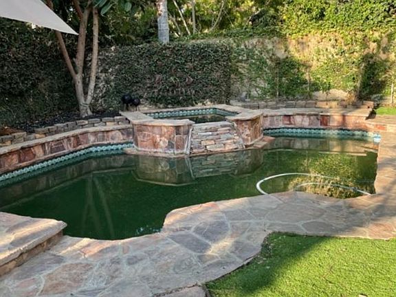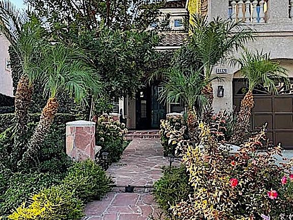 BEAUTIFUL landscaped & private "entertainers" backyard with trellis vine covered outdoor dining area, flagstone paths, outdoor ambiance string lighting, newly updated stone pool & spa, stacked stone & flagstone built in BBQ grill/counter island, glass pebble gas fire pit. Ample shaded seating/leisure/meditation areas. Generous shaded private canopy garden oasis plantings with mature palms, bird of paradise, avocado (yes you can make guacamole on demand), jacaranda, plumeria, roses, hydrangeas, trumpet & creeping fig vines etc. & a low maintenance backyard artificial turf/grass. A butterfly & hummingbird happy place! Plenty of sunlight & room to add herb & vegetable container gardening to your hearts desire.