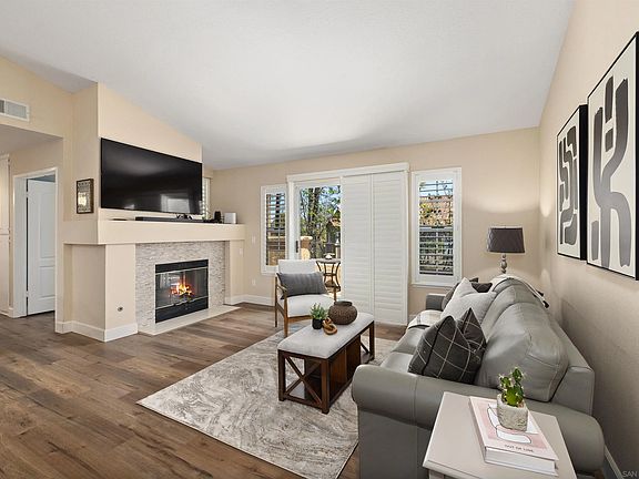 Imagine waking up to tranquility, yet being minutes from everything San Diego offers. This beautifully remodeled 2-bed, 2-bath townhome in Belsera isn't just a home; it's your personal retreat. Step inside and feel the spaciousness of vaulted ceilings and abundant natural light. The updated kitchen and cozy fireplace are ready for your everyday moments. A private balcony overlooks a lush greenbelt, perfect for morning coffee. With fresh paint, new flooring, and your own private attached garage, moving in is effortless. Beyond your door, enjoy Belsera's pools, spas, and recreational courts. Mission Trails Regional Park is your neighbor, and with easy freeway access, the airport and beaches are just 20 minutes away.