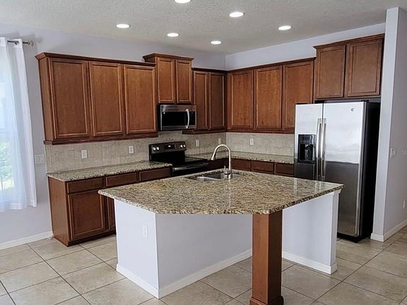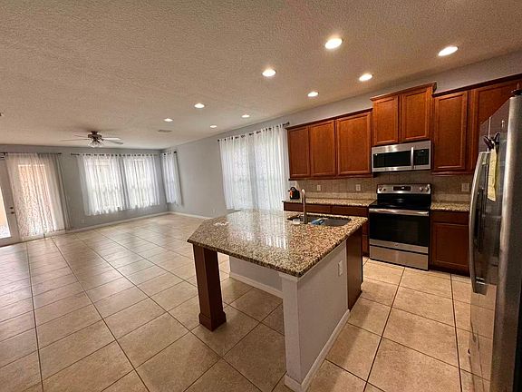 The spacious kitchen showcases tall cabinetry with crown molding, granite countertops, a tiled backsplash,refrigerator with filtered water and ice. The large island offers additional seating and connects seamlessly to the dining and living areas, ideal for entertaining.