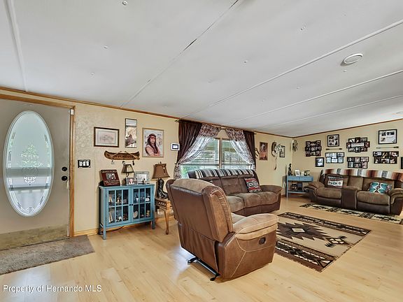 Looking for more space and privacy? Delightful and spacious 4-bedroom, 2-bath home that also includes an additional flex room. This 28x68 manufactured home is situated on a park-like 2.8-acre parcel on a paved road. Nestled in a peaceful setting, this home is perfect for families! Enjoy the tranquility of nature while being just minutes away from local amenities and schools. Bring the chickens! This property is zoned AR2 and includes 4 chicken coops in their own penned area. Farm animals welcome. Property is fully gated and fenced. This well-maintained home features an updated Roof 2016, updated AC-Heat Unit 2025, newer hot water heater and well tank. ADT security system installed. Interior features include a welcoming 13x17 living room, a separate 12x11 dining room and a generous 12x13 kitchen with ample cabinetry storage and a food pantry. If you love to cook there is plenty of space to add a center island for food prep or a breakfast bar. The inviting owner's bedroom includes a large 13x3 ft walk in closet. Just off the owner's suite is a separate flex room which would be great for an office, study, den or guest bedroom. There is access to the back porch from this room. This is a split floor plan. The three additional bedrooms and the second bath are located on the opposite side of the home. There is an interior laundry area just off the kitchen. Wake up in the morning and enjoy your coffee on one of two expansive covered porches located on the front and the rear of this home! The front porch faces east to view the sunrise or unwind after a long day at work on the back porch and watch the sunset. Beautiful mature maple and oak trees all around. There is also a spacious 20x24 covered pavilion with bench seating that would be great for family gatherings or your outdoor activities. There are two other outbuildings as well located in the backyard. A 14x24 shed with double door entry, electric and an alarm system. Plenty of room for all your tools, equipment, toys or could be used as a workshop. The other is a smaller 10x12 shed for odds and ends. This home is located close to shopping, restaurants, movie theaters and all other amenities on SR 50 and near the Suncoast Parkway for points north and south. Make your appointment today to view this awesome property!