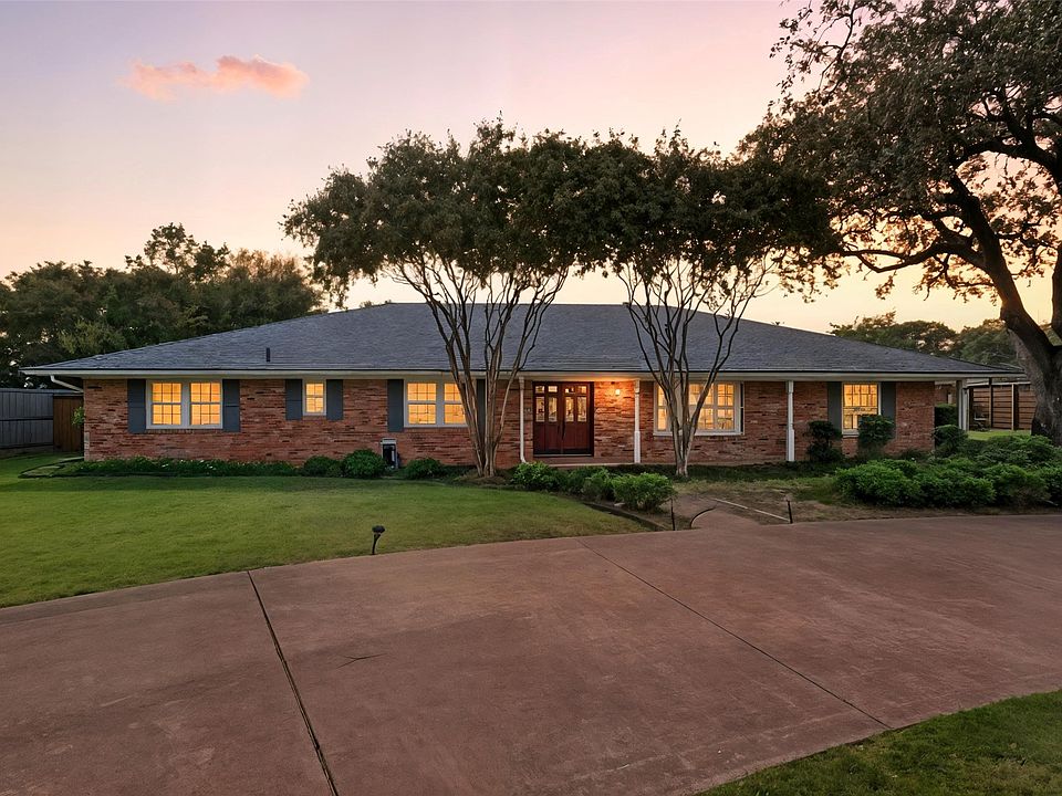Classic ranch-style home nestled on a generous .49-acre lot with a circular drive, ideally located in the highly desirable private school corridor. Inside, you’ll find a spacious, well-designed floor plan with beautiful hardwood floors and plantation shutters throughout the living, dining, and bedrooms. The open kitchen connects seamlessly to an inviting den featuring a beamed ceiling, a brick fireplace with raised hearth, pegged hardwood floors, and French doors that open to a charming patio and expansive backyard. The bedroom wing includes a large owner’s suite with dual closets, two front bedrooms connected by a Jack-and-Jill bath, plus a fourth bedroom with en-suite bath with guest access. A versatile