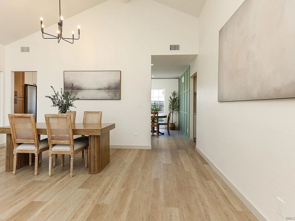 Beautiful Single-Story, Northwest Mira Mesa home with High Ceilings & Large Flat Backyard. Situated on a spacious 5,100 sq. ft. lot with a Large Flat green yard. The highlight is the Expansive Primary Suite, providing comfort and privacy. The living room impresses with its Soaring Pitched Ceilings, wood-like flooring, and elegant fireplace. The kitchen is the heart of the home, showcasing an Oversized Waterfall-Edged Island, stainless steel appliances, European-style pendant lighting, and striking two-tone cabinetry, all tied together with a custom breakfast-nook accent wall. Both bathrooms have been tastefully appointed with sleek, high-end finishes. Additionally, the home offers the convenience of Central HVAC. Don’t miss this RARE Mira Mesa gem!